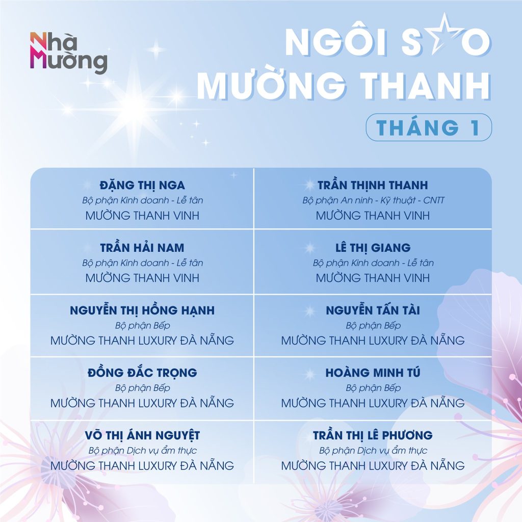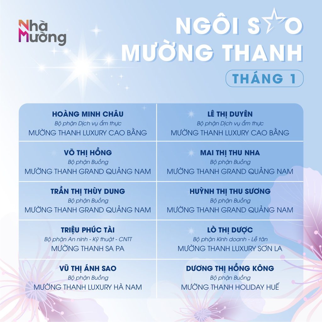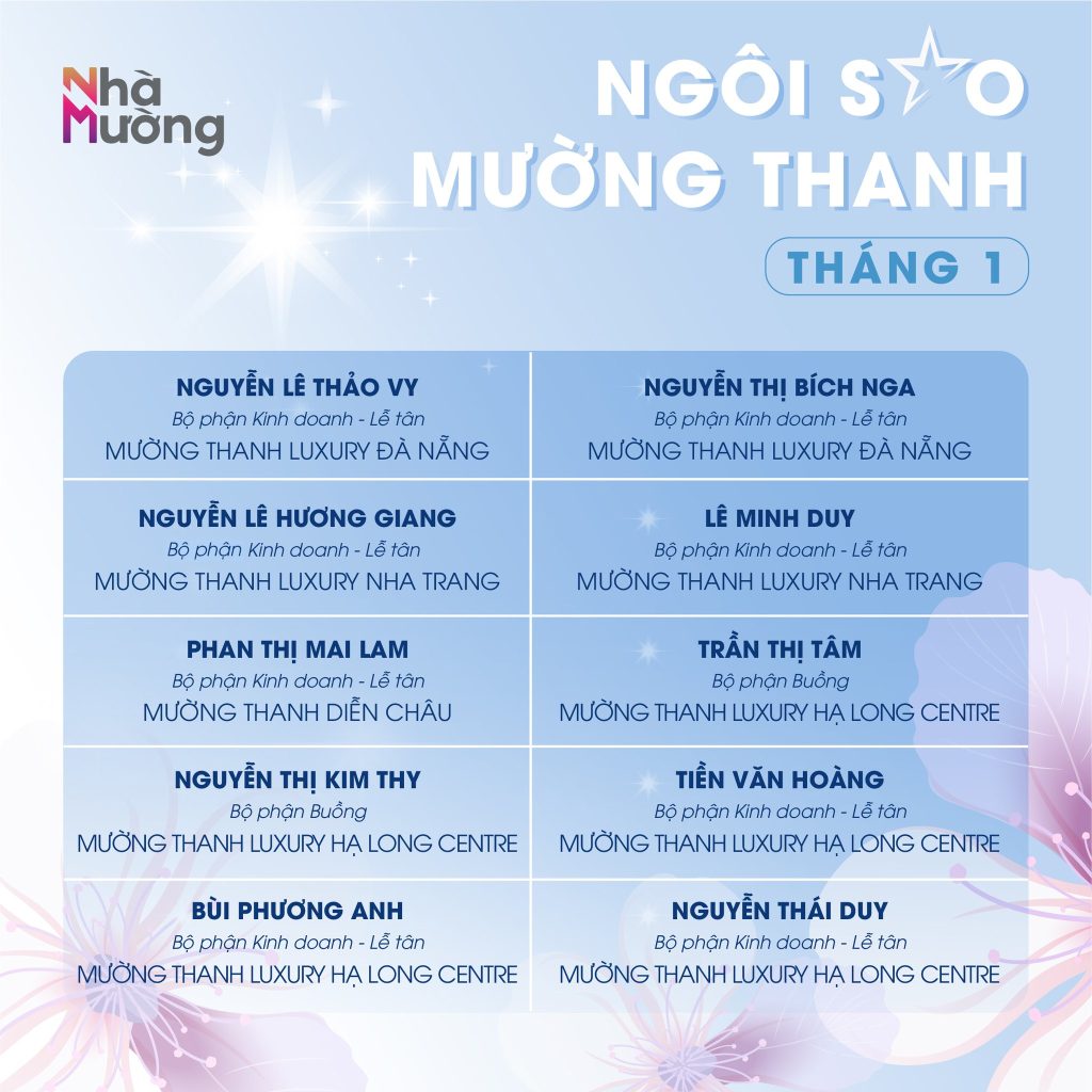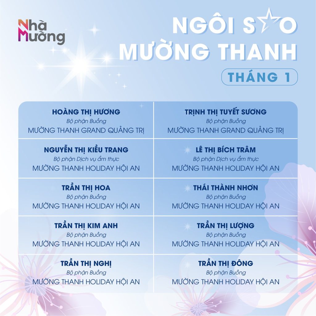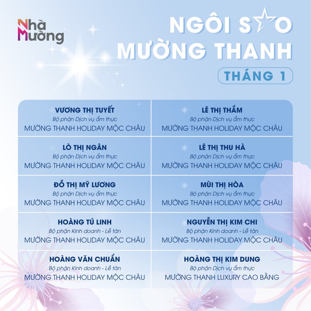 Không khí rộn ràng sau Tết vẫn đang lan tỏa khắp Nhà Mường, mở đầu năm mới bằng nguồn năng lượng tích cực và tinh thần sẵn sàng bứt phá. Trong nhịp khởi động ấy, cùng chúc mừng các Ngôi sao Mường Thanh tháng 1 – những gương mặt đã bắt đầu năm mới bằng sự nỗ lực và tận tâm trọn vẹn.