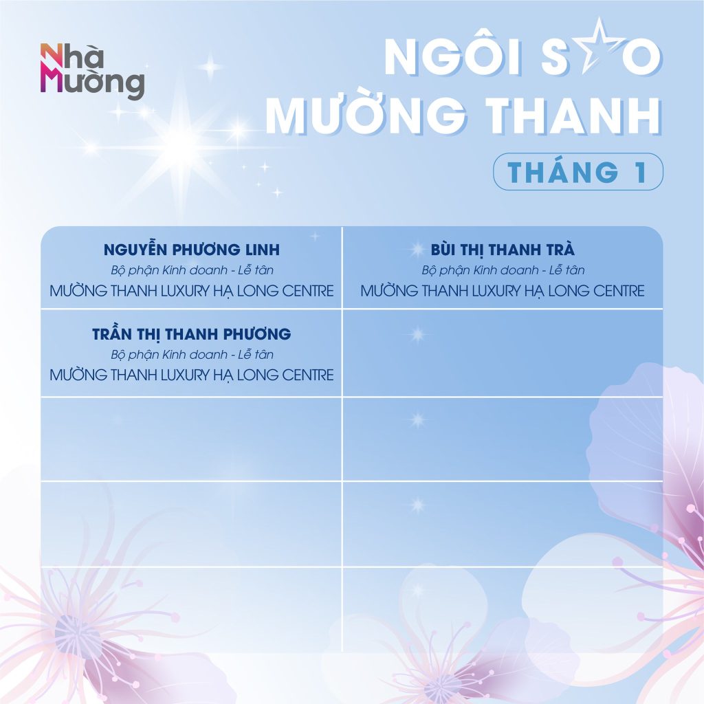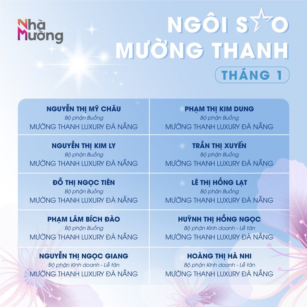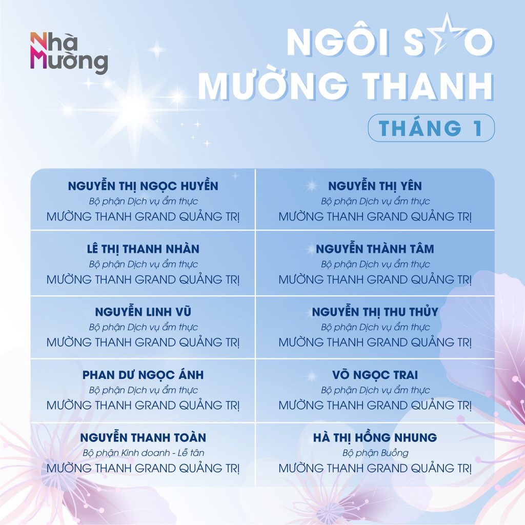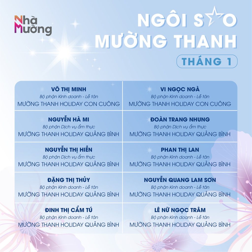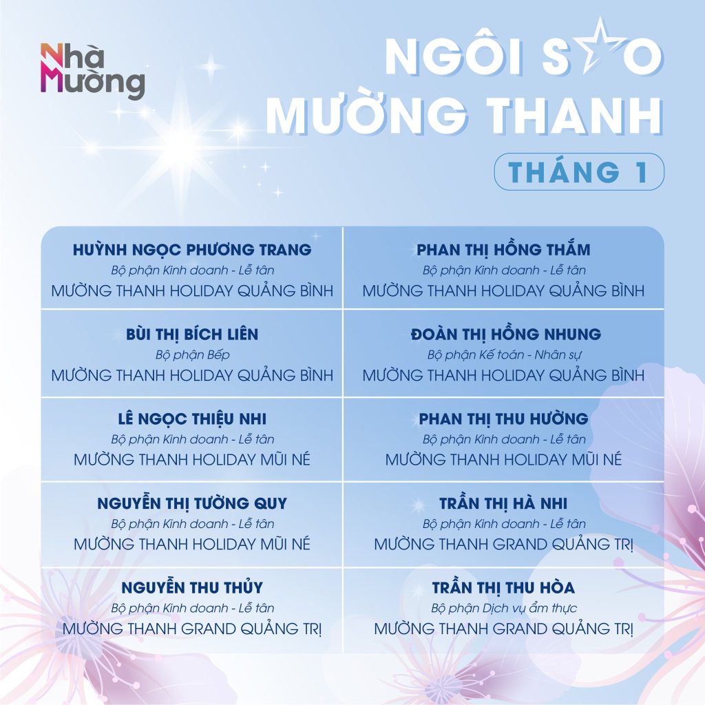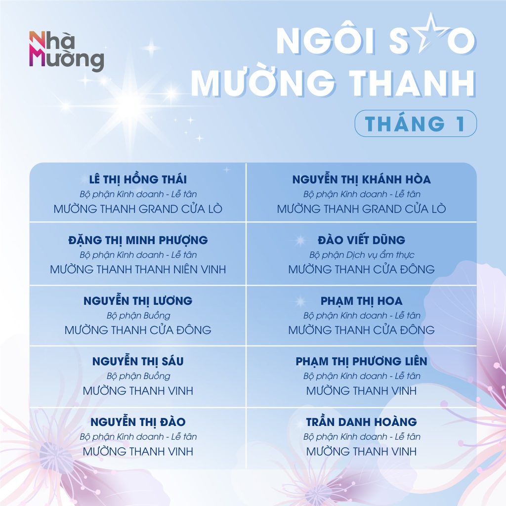 Không khí rộn ràng sau Tết vẫn đang lan tỏa khắp Nhà Mường, mở đầu năm mới bằng nguồn năng lượng tích cực và tinh thần sẵn sàng bứt phá. Trong nhịp khởi động ấy, cùng chúc mừng các Ngôi sao Mường Thanh tháng 1 – những gương mặt đã bắt đầu năm mới bằng sự nỗ lực và tận tâm trọn vẹn.